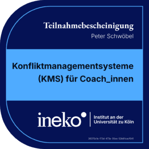 • Ausbildung sowohl zum zertifizierten systemischen Coach und Change Manager und zum zertifizierten systemischen  Supervisor am INeKO, Universität Köln.